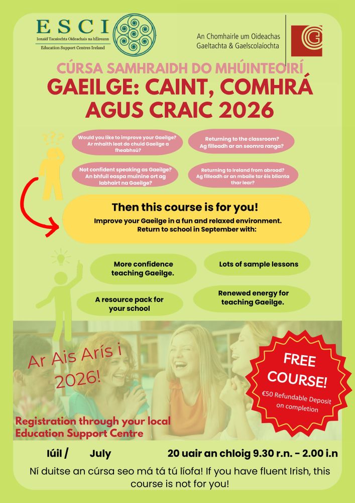 Boost your confidence in speaking and teaching Irish with Gaeilge: Caint, Comhrá agus Craic 2026! This fun and supportive summer course helps teachers improve conversational Gaeilge, explore practical classroom ideas, and gain ready-to-use resources. Return to school in September with fresh energy, new skills, and greater